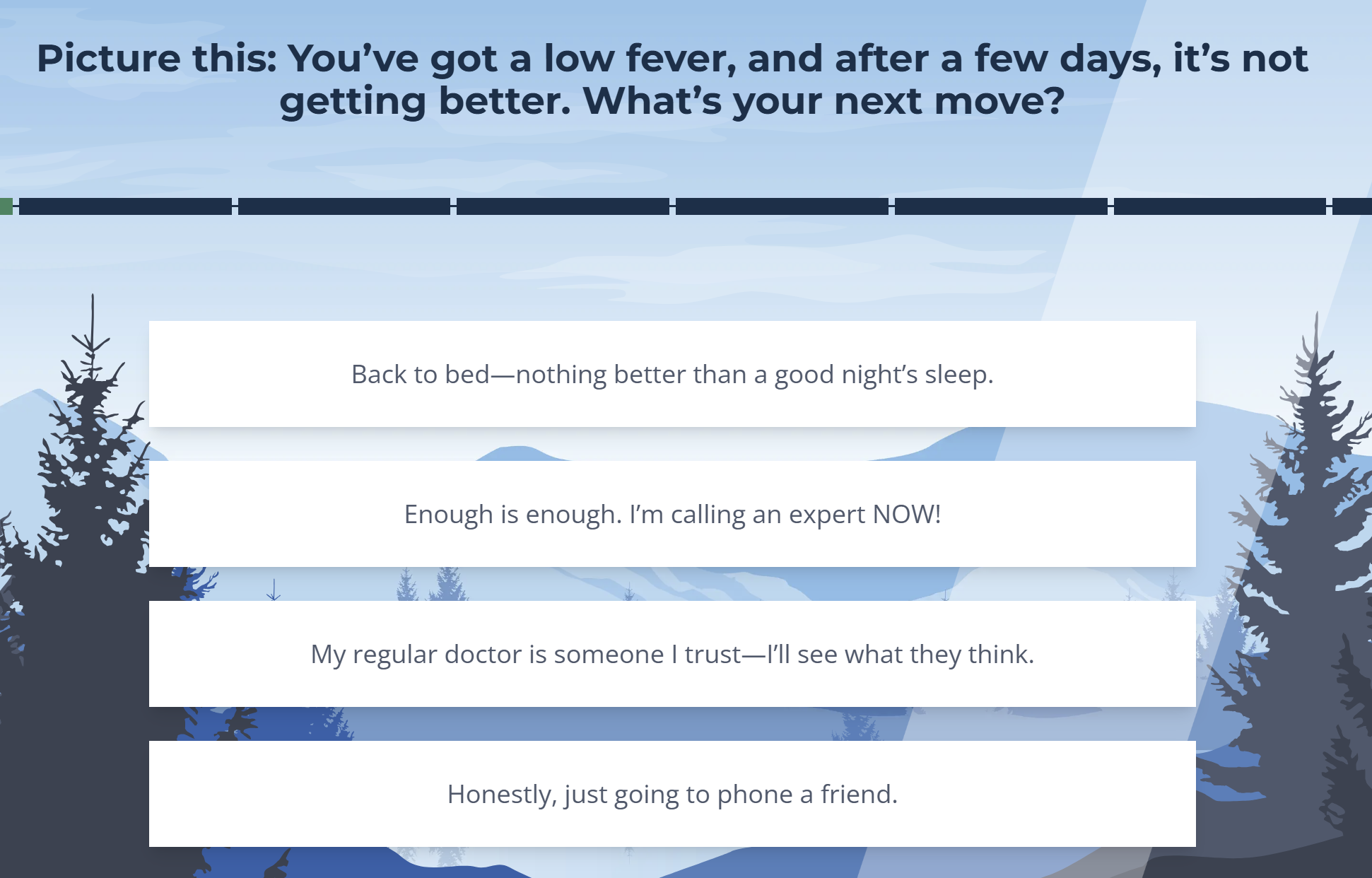 After fully ingesting the dense and technical information required for the project, I settled on developing a quirky personality quiz. By bringing these abstract benefits into everyday situations, we were able to translate what made them special more effectively. Although everyone who plays the quiz receives information about the same benefits, the information is presented in a personalized way that corresponds to their personality and preferences.
