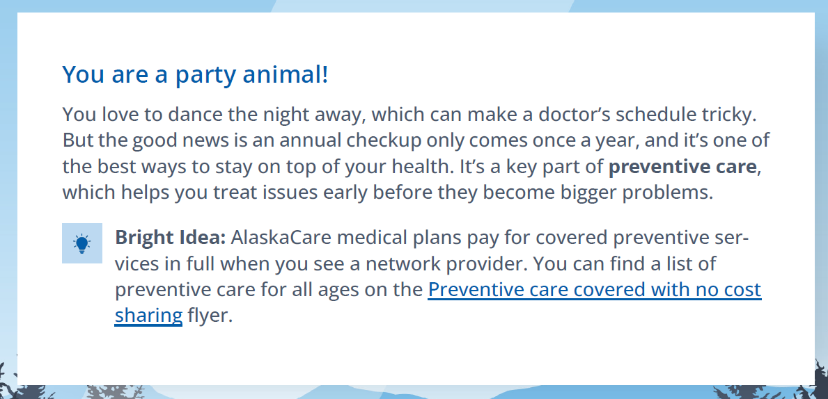 Alaska’s state government had a problem. They offer their employees a rich benefits package, but employees weren’t using the benefits available to them. Benefits information is complicated, easy to skim and forget, so employees weren’t aware of all of the free programs and coverage options they had access to. Our mission was to find a way to educate the State of Alaska’s employees about their benefits in a way that was fun, accessible, and sticky.