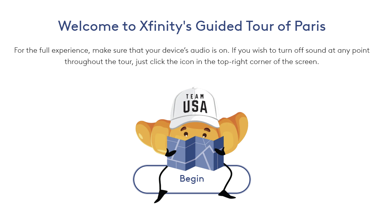 All the brief asked for was an interactive experience that educated employees on the finer points of the Olympics Viewing Experience on Xfinity. What we delivered was an interactive walking tour of Paris led by the sensational character find of 2024, Christophe the Croissant, who taught employees about both Parisian landmarks and critical Xfinity UI elements. I concepted and designed the game myself, working closely with the art department to design Christophe and with the engineering team to figure out what was possible with our time and budget. Most importantly, I sourced a French friend of a friend of a friend’s child to voice Christophe in his few speaking lines.